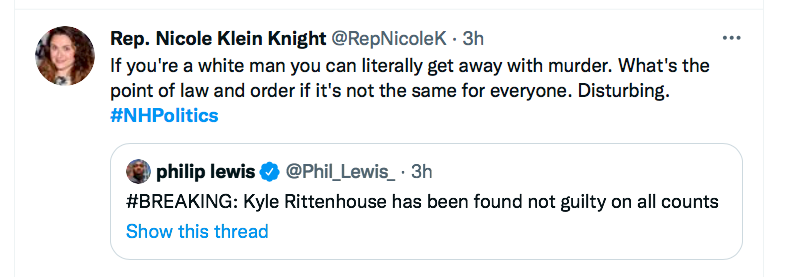 As a preliminary matter, I am aware that Rep. Nicole’s tweet appeared in a post by another author regarding her and other NH-Democrats’ reactions to the Rittenhouse verdict. But I think it is worth taking a deeper look at Rep. Nicole’s tweet.