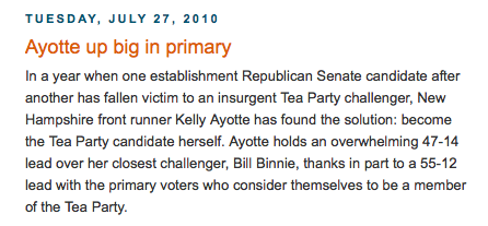 Do you remember the 2010 election … specifically the Senate race? Kelly Ayotte was the Tea Party candidate. For example, from Public Policy Polling: