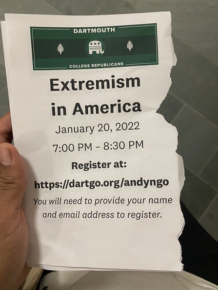 The Dartmouth Administration, may I point out, also LIED to everyone that got this ripped piece of paper. Note that it has the Dartmouth College Republicans Facebook logo on it. I’ve been told that NONE of the DCRs knew about this flyer, didn’t know that the meeting was being handed a “fait accompli” – either do it our way or it’s NO way. It turned out that only 5 or 6 people were allowed into the “virtual meeting” room instead of the hundreds that were coming. Many, like myself, from hours away, were told “you aren’t wanted here.”