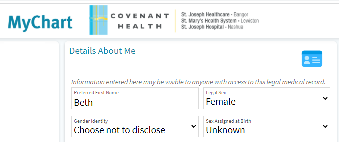 Friday, I logged into the patient portal for St. Joseph Hospital in Nashua, NH to update my medical records and it prompted me for my “legal sex”, my “gender identity,” and my “sex assigned at birth.” Nowhere did it ask for my biological sex.
