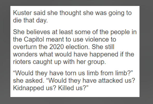 This is a quote from a sitting member of congress about the events of January 6th. Nit the actual events but the ones the Left has been circle-jerking around the caucus campfire for twelve months.