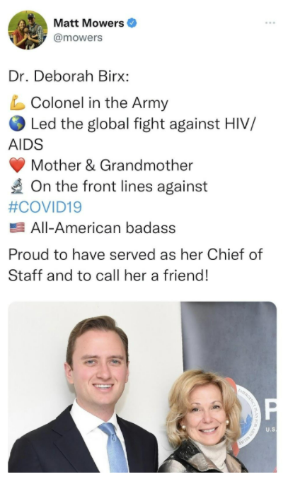 In a 2020 CNN article titled, ‘How Fauci and Birx got Trump to listen to the science,’ Matt Mowers is cited as being *THE* reason Dr. Birx received the top job in the West Wing.