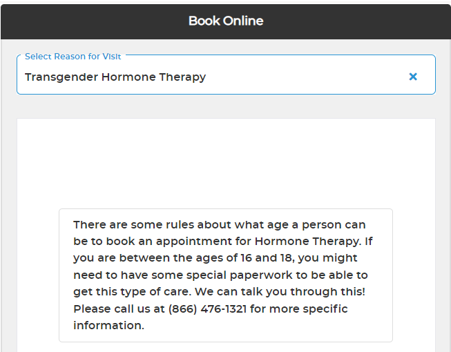 On the website for Planned Parenthood in Manchester, New Hampshire, I requested an appointment for “Transgender Hormone Therapy.” When I was prompted for my birthdate, I entered a date in 2006, making me 16-years-old, and the website encouraged me to come into Planned Parenthood to fill out some “special paperwork” to get cross-sex hormones.