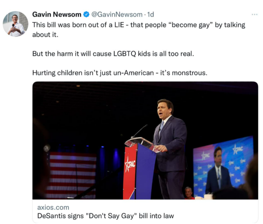 On the other end of the spectrum is Gavin Newsom. The WOKE Governor of California is driving the state to bankruptcy and moral depravity. Every decision is for the benefit of the Left. Newsom’s comments on the Bill signed by DeSantis are laughable. Newsom went to Twitter: