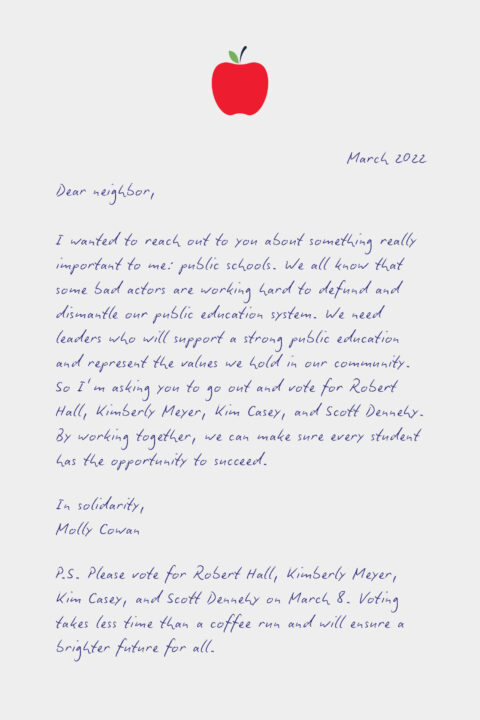 “Dear Neighbor,” reads one letter received by Jessica Williams, of Wolfeboro, last week. “I wanted to reach out to you about something really important to me: public education.” The letter appears to be handwritten and signed “in solidarity,” by Edie DesMarais, a Wolfeboro Democrat who was a member of the New Hampshire House of Representatives from 2017 to 2020. Education is so important to DesMarais that she signed a form letter.