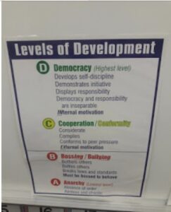 In this wacky scheme, “D” — which is usually a near-failing grade — is the highest level, standing for Democracy. “C” — typically an average grade — is the next highest level and requires students to “conform to peer pressure.” “B” and “A” — which are considered high grades by most people — in this scenario are the bad or “red” levels and stand for “Bossing/Bullying” and “Anarchy,” respectively.