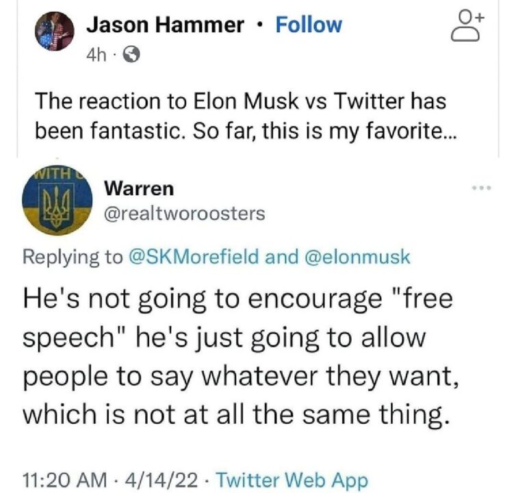 And while Musk didn’t pass a law, whether he buys a path to ownership of Twitter or not, he has done us a public service. Democrats are proving once again that free speech is a threat to their authoritarian tick, and they are PROUD of that.