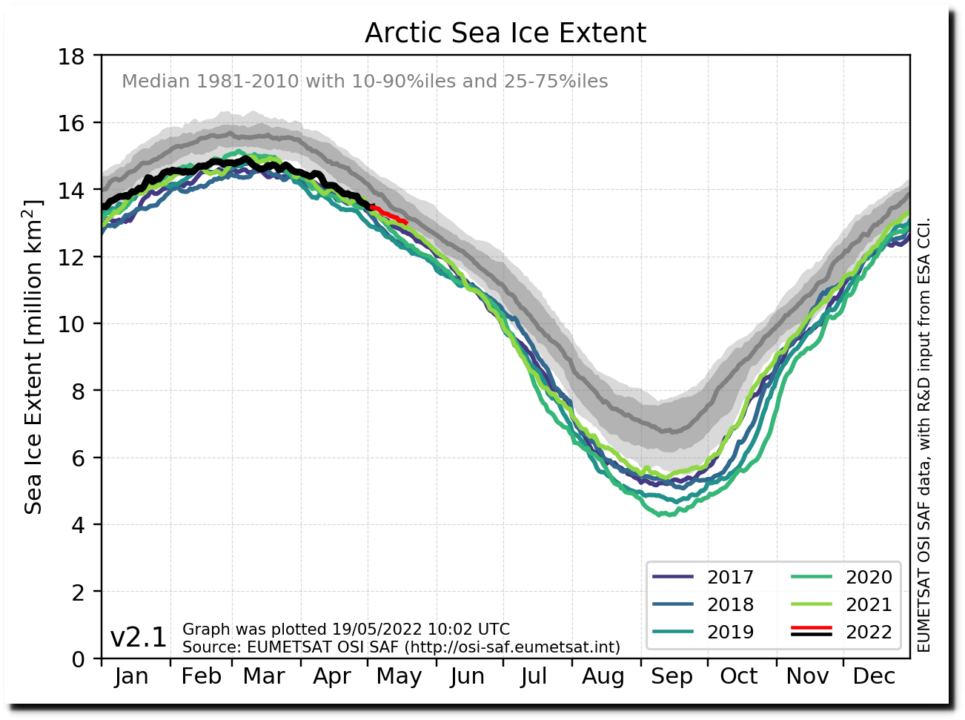 May 19 Arctic sea ice extent is above the average since 1989, and higher than 1995, 1997, 2002, 2003, 2004, 2005, 2006, 2007, 2008, 2010, 2001, 2014, 2015, 2016, 2017, 2018, 2019, 2020 and 2021. Ice extent loss so far this month has been the lowest in over 30 years.
