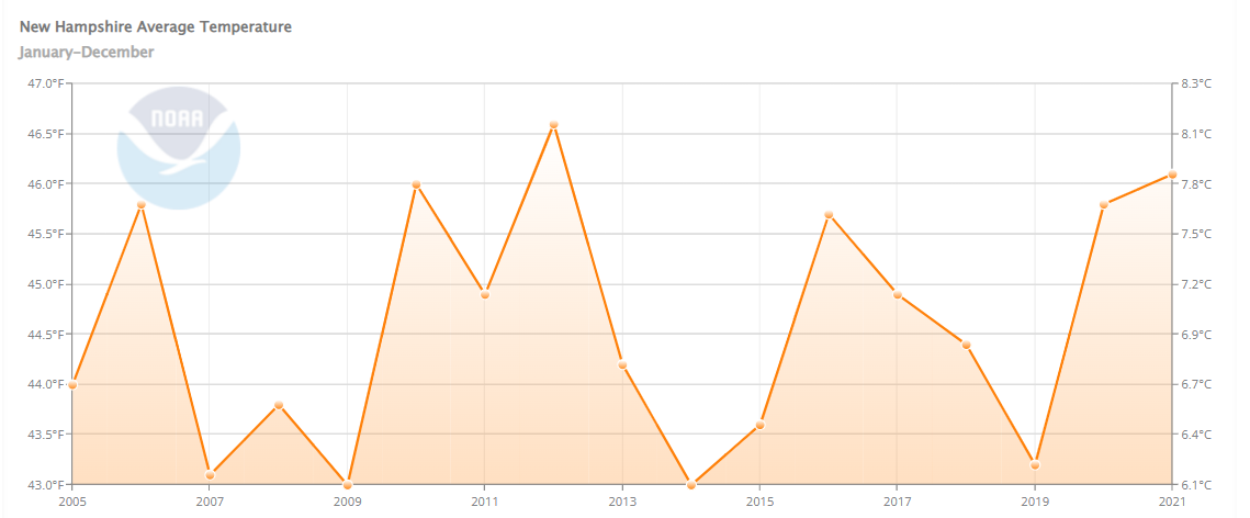 And I was unable to duplicate WMUR’s wettest years’ numbers, but two things become apparent when looking at NOAA’s graphed data. First, most of New Hampshire’s “wettest years” were between 2005 and 2011.