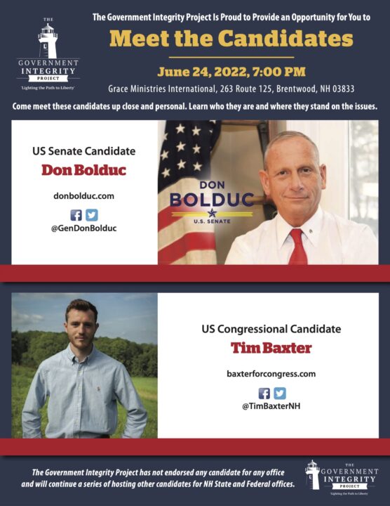 Two candidates for federal office will be hosted: General Don Bolduc (U.S. Senate) and Tim Baxter (U.S. Congress – CD1). Come and hear what they have to say about the issues that are important to you. Meeting candidates in person adds another dimension of understanding that leads to casting a more confident, and more informed vote.