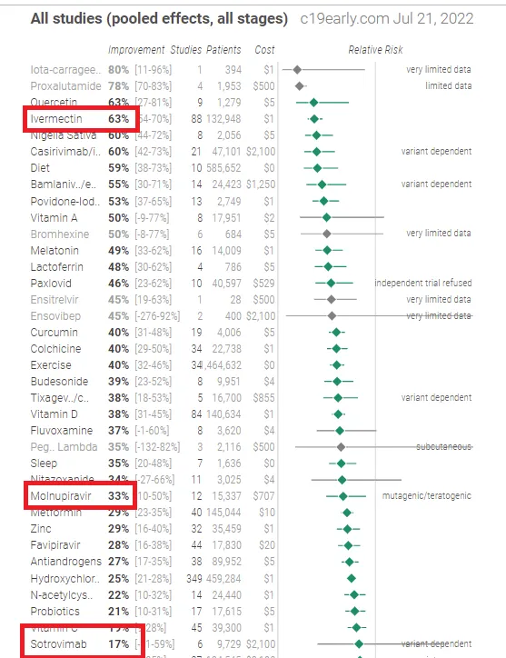 Make sure you take a look at the cost column. Treatment with Ivermectin costs 1.00. Molnupiravir is 707.00 dollars, Sotrovimab, 2100.00, and Paxlovid at $529.00 (not free, just because Biden spent a few billion for those at your expense). Fluvoxamine is only $4.00 but ranks as only 37% effective compared to Ivermectin which ranks well at the WHO.
