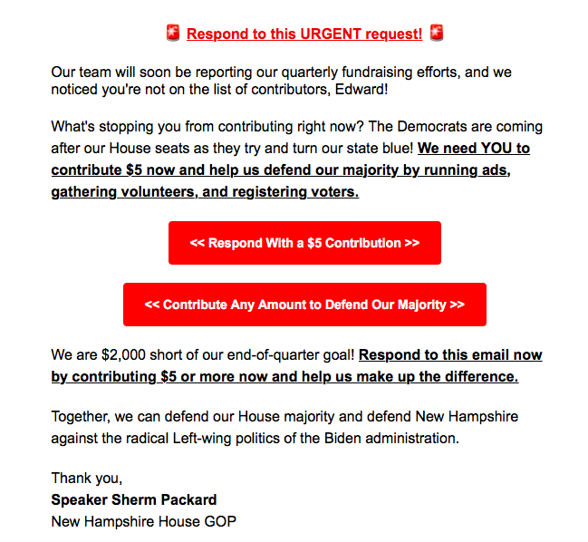 So I regularly receive emails seeking money for the NH-House Republicans. Apparently whoever maintains their email list is unaware that although I am a Republican I definitely do not consider myself a NH-Republican, which are in my opinion two very different things.