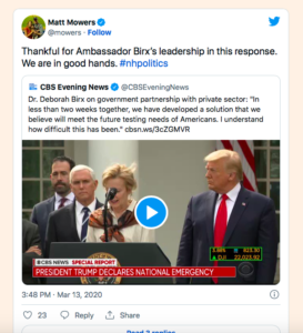 So … on July 18th, National Pulse published an article spotlighting the ties between Matt Mowers and the nefarious, mendacious “Dr.” Deborah Birx. The article presents itself as an expose of Birx, but it clearly is aimed at Mowers, and was probably ghostwritten by the Leavitt campaign.