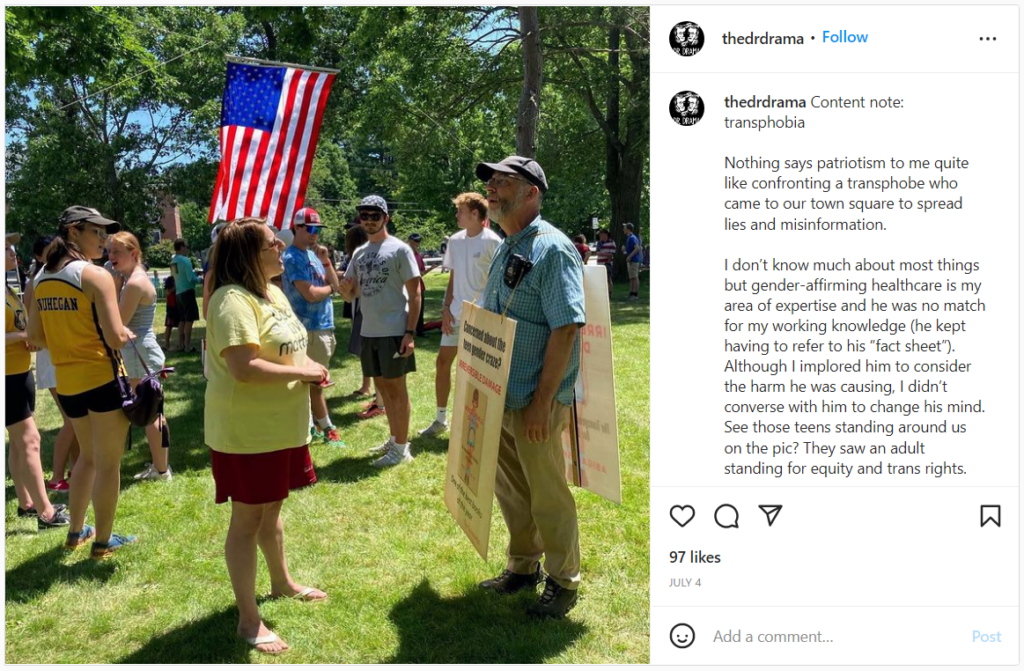 “This literally kills people,” said the woman who approached me at the Independence Day commemoration on the Amherst, NH village green. I was wearing signs promoting Abigail Shrier’s book “Irreversible Damage: The Trans Craze Seducing Our Daughters” when she interrupted a discussion I was having with two young men about the dangers of medicalizing gender-confused teens.