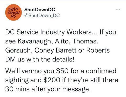 Bounties put on conservative SCOTUS justices’ locations. If that doesn’t send a shiver up your spine…
