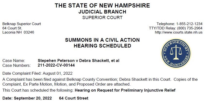 While a judge was not found/available/willing to issue a Temporary Restraint Order that a gentleman by the name of Stephen Peterson put in on August 1st, a Summons has been issued in the case. Who knows what it will force given it isn’t until September 8th. The only fact that is apparent is that a judge has deemed that the actions of the Belknap Delegation were sufficiently egregious as to warrant it being heard.