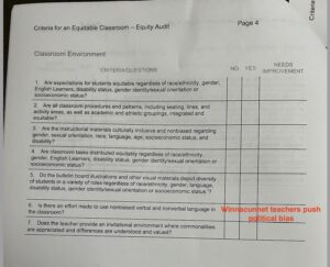 This gets even more interesting when you peruse the “Equity Audit” that was conducted in SAU21. Under Classroom Environment question #6 asks: Is there an effort made to use non biased verbal and nonverbal language in the classroom? I think we can safely say in this example, the answer is NO.