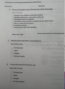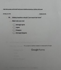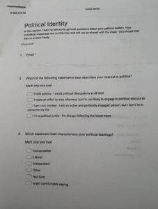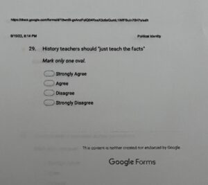 While I did not see a vendor listed on the survey, the document was uploaded through Google Docs. If this was administered by a vendor, then there should be some kind of privacy statement. However, it looks as if the teacher may have drafted the survey for his students, and then used Google docs as the online source.Google has been sued by Attorneys General in New Mexico and Mississippi over children’s privacy violations. Several legislators in New Hampshire worked on this statute to prevent surveys like these from being administered without informed parental consent. This survey transmitted through Google Docs included the student’s name and email address. These are the surveys that legislators in New Hampshire said they wanted parents to be aware of, and that needed consent.Please see testimony fromEmmet McGroarty who recently served as an attorney for the American Principles Project. This testimony was presented to the Commission for Evidence Based Policy on October 21, 2016 regarding student data privacy.This survey was a way to gather personal information on students, versus an assignment that would have benefited children who could be learning historical academic content. This is happening more frequently, and it appears to be more about examining the values and attitudes of students. There is less of a focus on learning quality academic content in the core subjects, and more indoctrination as an attempt to change the political viewpoints of students.Parents are fed up with this kind of approach used in the classroom. Parents are not looking for a teacher to push their political views but instead, one that will teach the academic content in an unbiased manner.I am filing this complaint on behalf of several parents whose children took the survey but found out about it after it was completed. They do not want any backlash aimed at their children, so I am filing this request without publishing the names of those parents.Thank you for your attention to this matter.