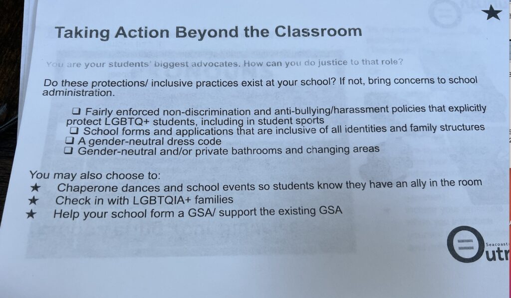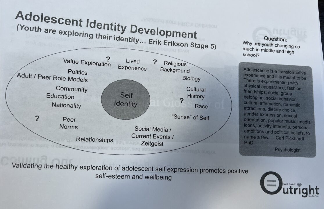 For instance, Seacoast Outright has a political message that will conflict with some of the families in the district. Those families may not feel comfortable addressing this with the school board or administration for fear of retaliation that could be directed at their children. This makes for a hostile district that is exclusive rather than inclusive.