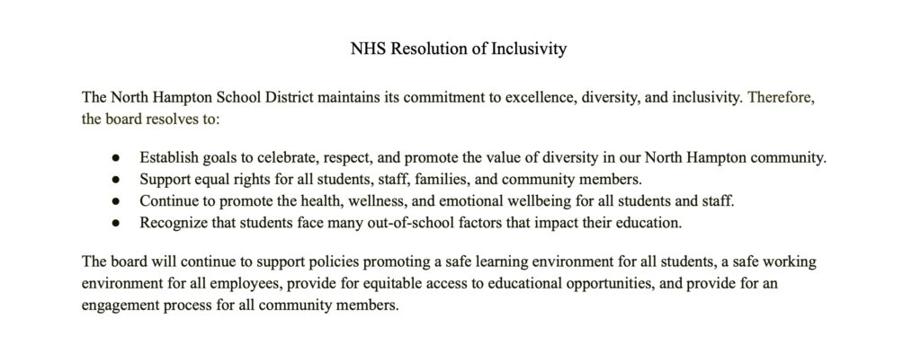 The North Hampton school district recently issued a Resolution of Inclusivity. We have not seen the leadership under Superintendent Nadeau, and Assistant Superintendent David Hobbs support the religious families in the district, and in fact, we feel they have created an environment that appears to be discriminatory and hostile instead.