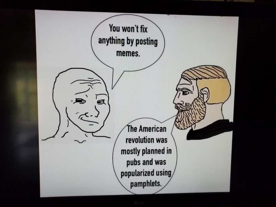 Many really good ones and it was hard to choose, but… this was it. Remember, a bit of unpalatable truth is often palatable when concealed in humor. This is why memes are so effective. Well, that, or they lose their temper. And then, from yesterday: