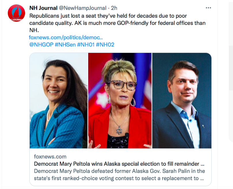 Palin lost because there were two candidates running as Republicans, versus only one Democrat. The other GOP candidate was an Establishment candidate whose evident mission was to prevent Palin from winning. Many of his voters failed to make Palin their second choice or even chose Peltola. He intends to run again in the general.