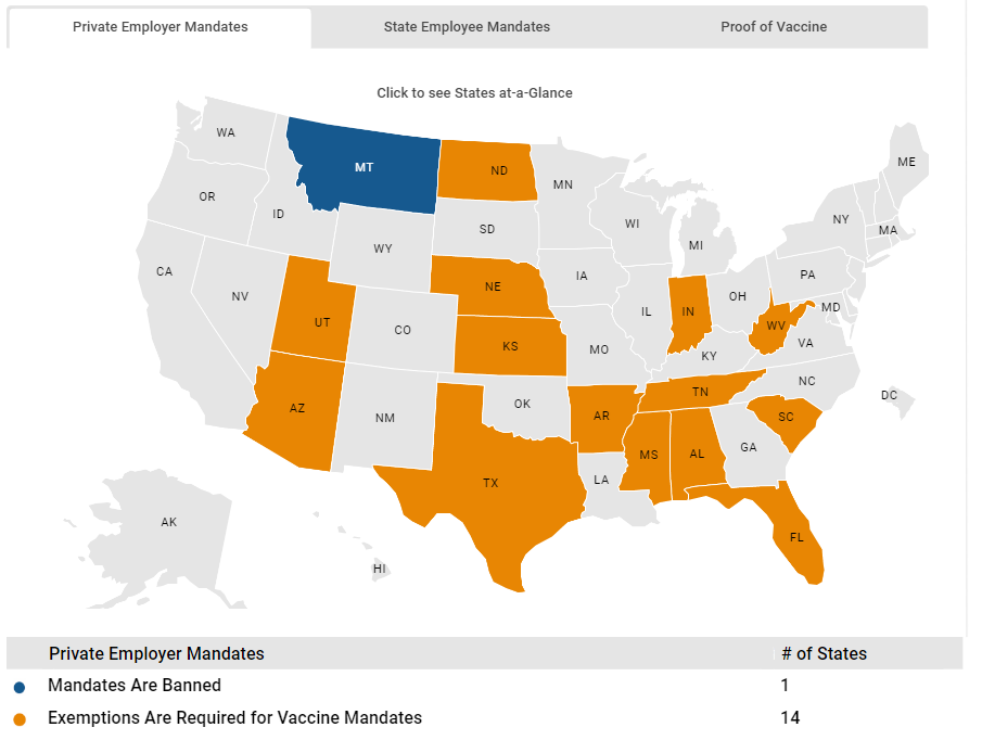 But only 14 states by law require private employers to accept exemptions from covid-19 mandates. Only Montant prohibits them for private employers.
