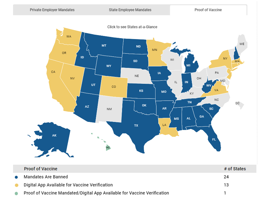 The National Academy for State Health Policy has interactive maps (screengrabbed above) if you’d like to check the laws of any state you live in or plan to work in or visit. For example, twelve states and DC have state employee injection mandates.