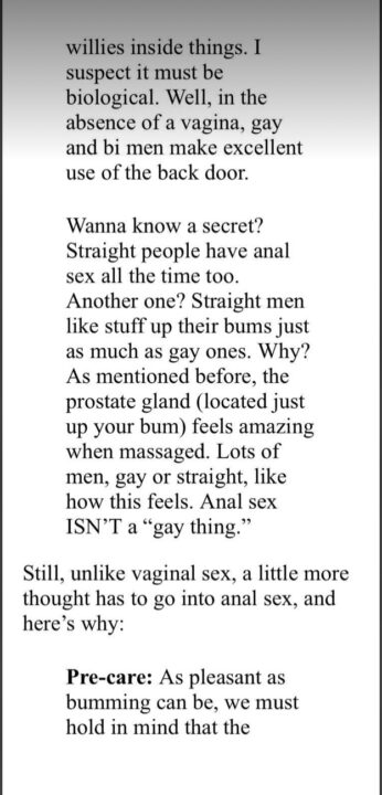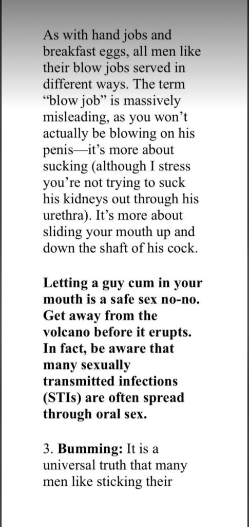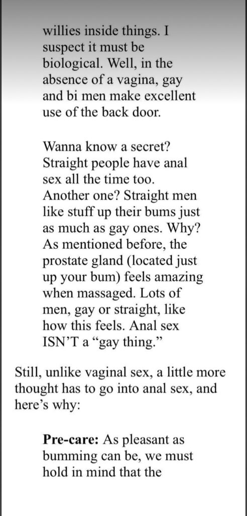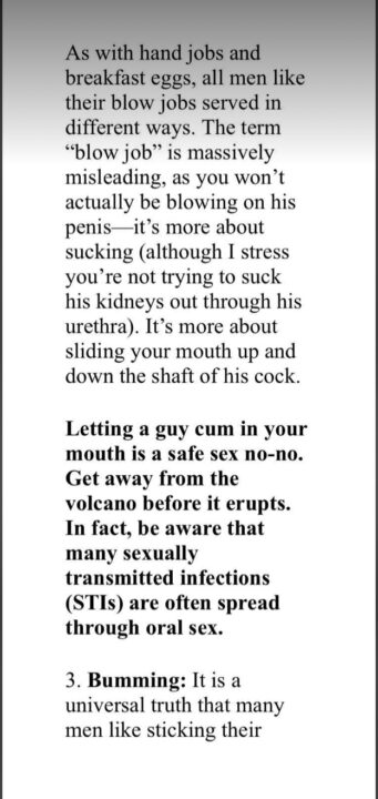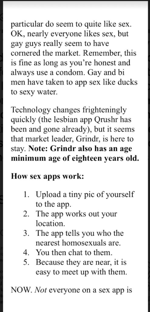 The book one parent references gives children graphic descriptions on how to have sex, and where to meet up with partners. This isn’t the biological facts that students learn when it comes to reproduction, it’s a detailed guide on how to give hand-jobs, and blow-jobs, etc. They are sexualizing children– there is no other way to describe it.
