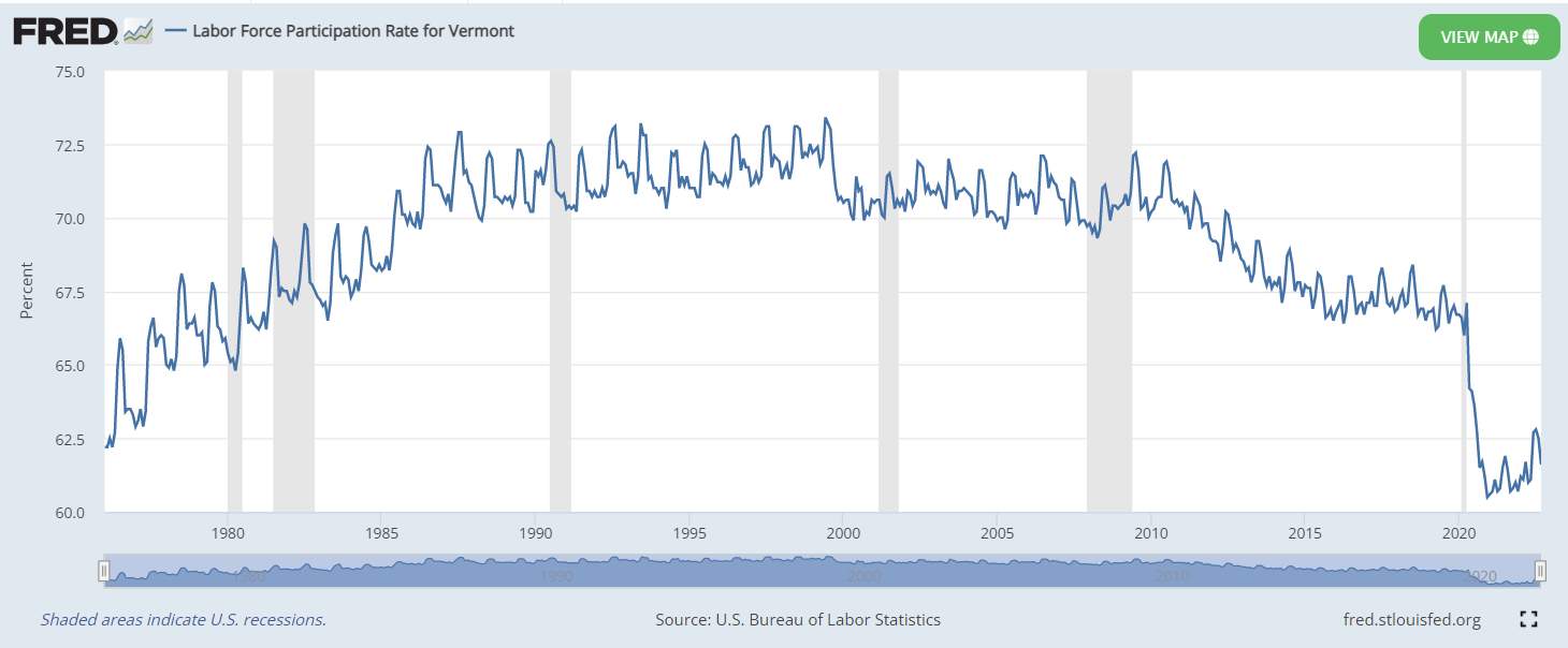 Vermont’s labor force dropped nearly 7% in 2020 with the COVID lockouts (to 60.6%). It has only managed to scramble as high as 62.7%, with September numbers showing 61.6%.