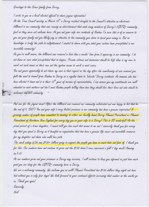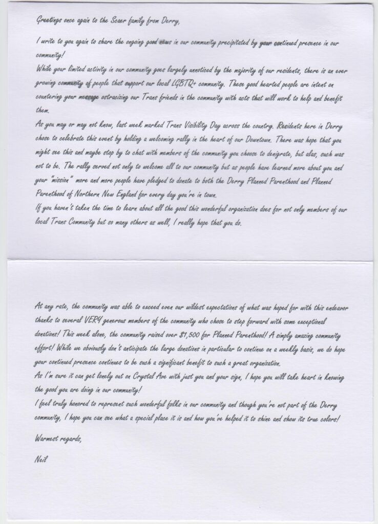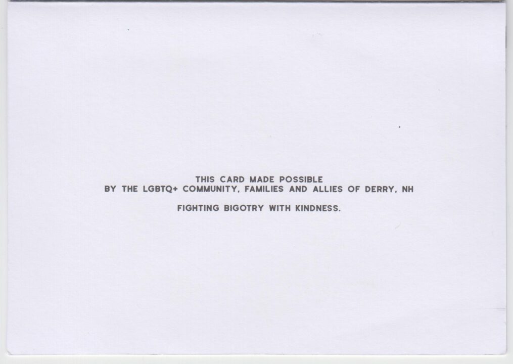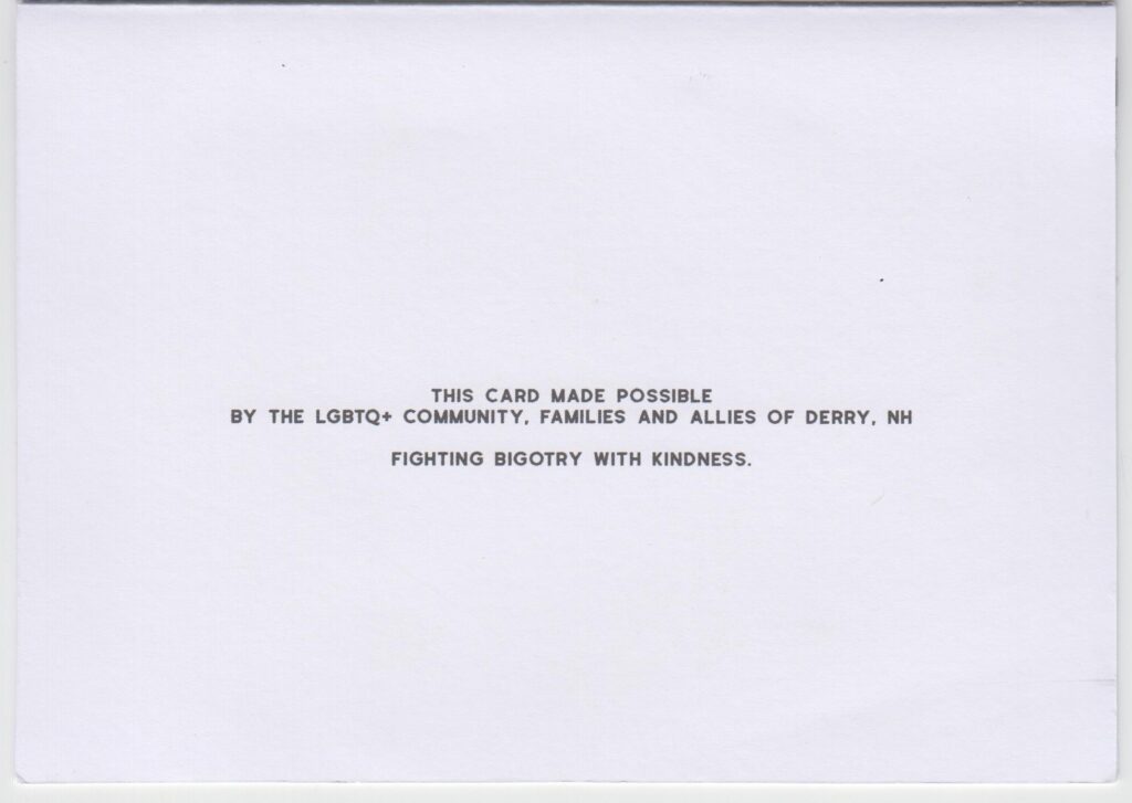Last spring Derry Town Councilor Neil Wetherbee informed me about this plan in two passive-aggressive thank you cards (see below) with a return address of Derry Town Hall and stamped “This card made possible by the LGBTQ+ Community, Families and Allies of Derry, NH fighting bigotry with kindness.”