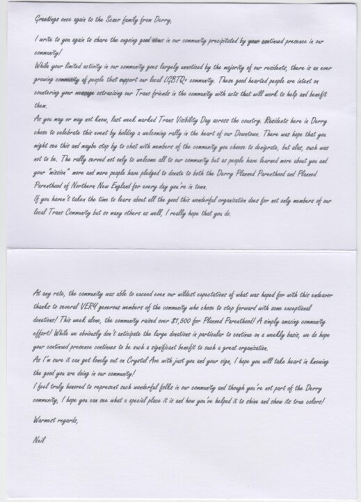 I believe what upset Stephan [sic] so much, is that the group of Derry residents decided that each time he protested on the sidewalk we would donate to charities that support caring for Trans people in his name.