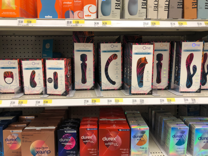 The descriptions readily viewable on the packages are quite graphic. Little Massager – a powerful vibrator for vulva play. Vibrating Stroker – a ribbed massager for penis play. Stroker – a double-sided toy for penis play. Stroker Lotion – a self-play cream for penis play. Bloomi – a clitoral and body massager. A whole array of Plus One vibrators – vibrating ring, mini massager, vibrating bullet, fluttering arouser, dual vibrating arc… You get the idea.