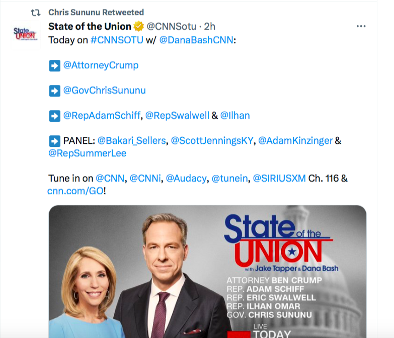 So here is a retweet by Sun-King Sununu of a CNN tweet for a CNN Sunday morning show. The company the Sun-King keeps! Schiff, Swalwel and Ilhan! RINO-traitor Adam Kinzinger!