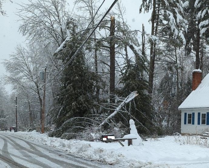It’s not the worst we’ve seen or the worst from this storm. But it comes with the territory. Lots of snow, mostly wet and heavy. White pines are everywhere and in abundance. That weighted snow has a way of bringing them (or parts of them) down, and they don’t always miss the infrastructure.