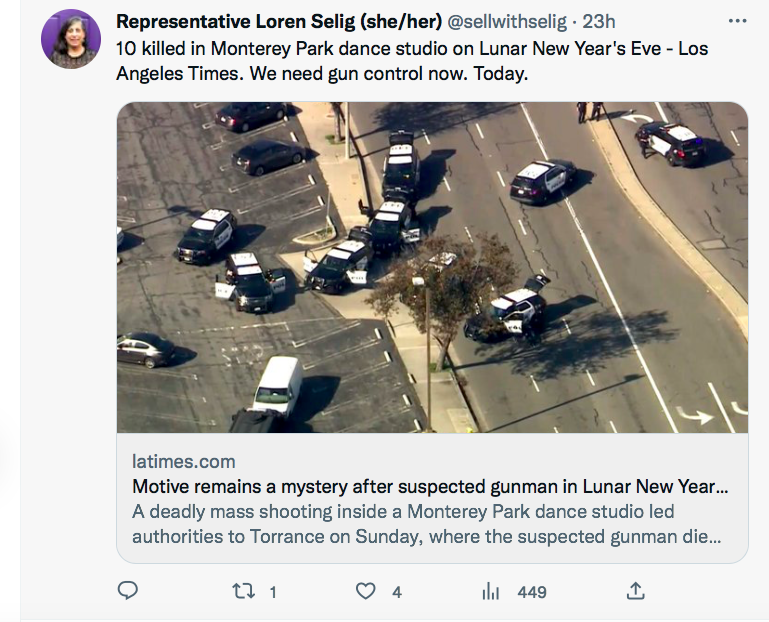 So here is a tweet from some NH-Democrat State Rep demanding “gun control” in response to the Monterey shooting. Needless to say, the gun in question is already illegal in California. So either this Staes Rep is ignorant or dishonest. It really doesn’t matter which. Whether it is ignorance or dishonesty, this State Rep has no business being a State Rep or serving elected or unelected in any government position.
