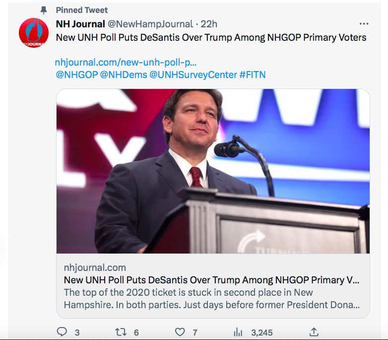 Mikey Graham at NH-NeverTrumpJournal has been pushing Ron DeSantis for President … simply because his NeverTrump masters see DeSantis as NeverTrump’s best hope of stopping Trump. Today he is trumpeting a UNH “poll” that shows DeSantis in the lead in the FITN primary … which assumes that the RNC doesn’t get its act together and pull FITN status from this very BLUE state: