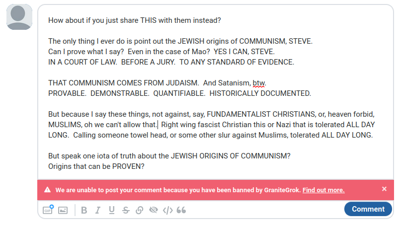 And for the record…it’s nice to hide behind “Completely Unmoderated content means allowing threats of death or harm, sexually explicit remarks or innuendos, acts of violence, pornography, or anything the human mind can think to write.” while using that mentality to restrict people from speaking against their Jewish masters.