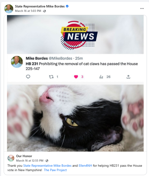 I commented on Rep. Bordes’ Facebook page under his most recent post about his declawing bill.