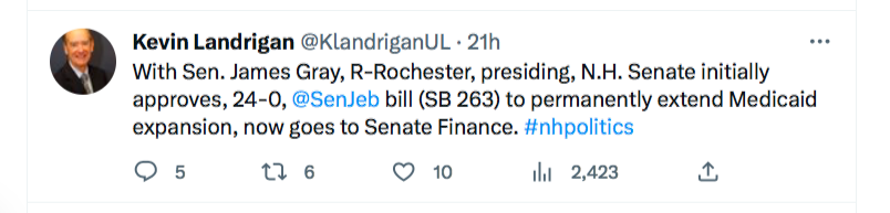 These faux-limited-government, faux-fiscal-conservatives State-Senators will tell you that they are keeping the costs of healthcare down because otherwise the hospitals would have to pass on the cost of unreimbursed medical expenses to you and me … which is TOTAL B.S.. It’s the equivalent of all the elites on twitter telling us that, despite being quintupled vaccinated, they’ve caught COVID … BUT it would be so much worse if they hadn’t gotten all those jabs. If Obamacare Medicaid Expansion worked the way Jeb Bradley and his fellow faux-fiscal-conservatives claim … then we would have seen a reduction in the cost of health care when they first passed the program. We did NOT.