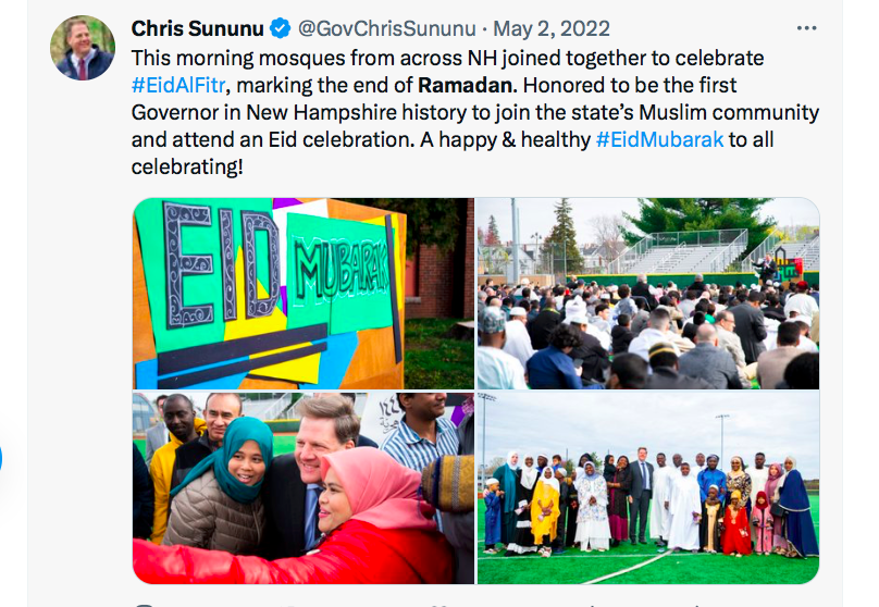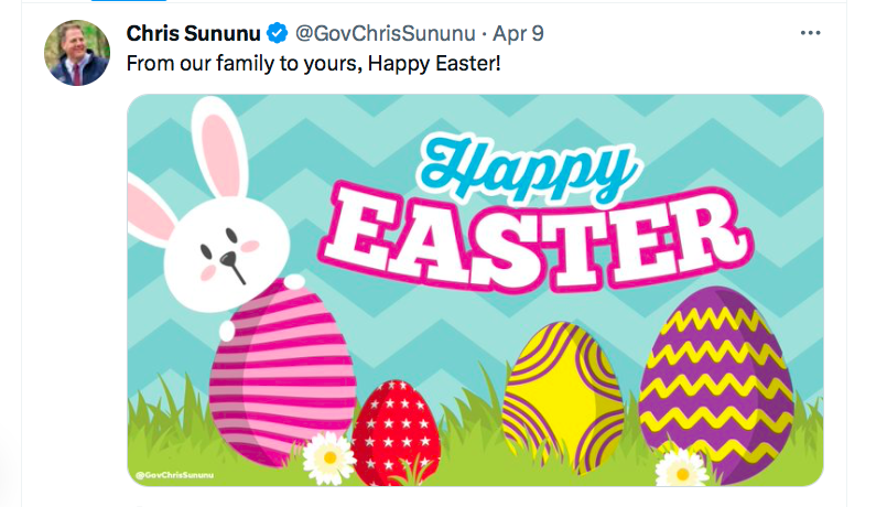 Sun-King Sununu tweeted about Easter, but his tweet said NOTHING about Easter being a Christian holiday: