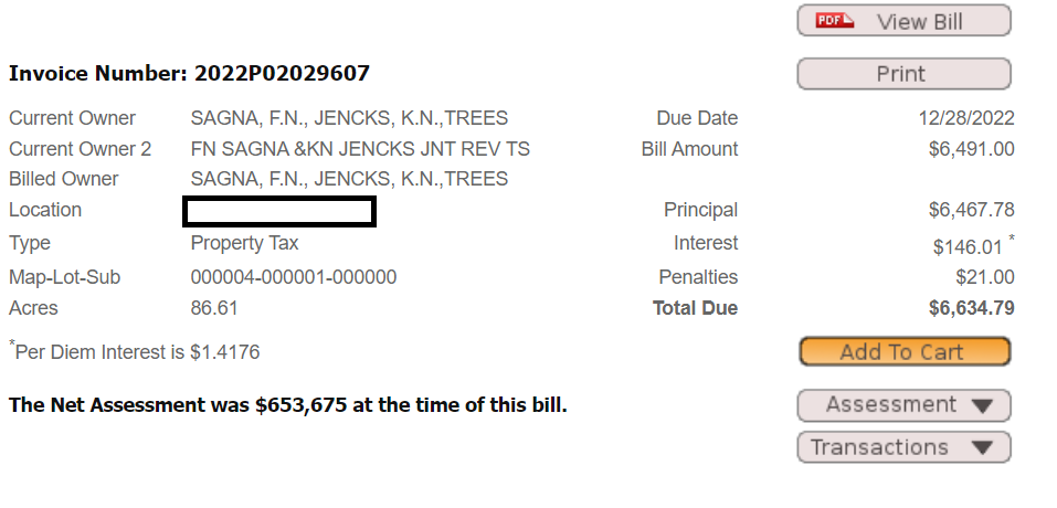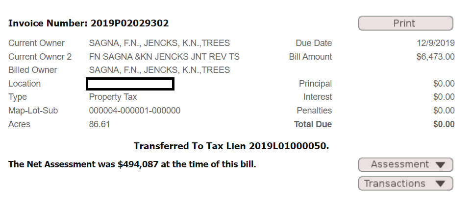 It appears to be a business and residence, so – maybe the check is in the mail? It might be, but this does not appear to be the first time. The Dec 2019 entry indicates the amount due was transferred to a tax lien.