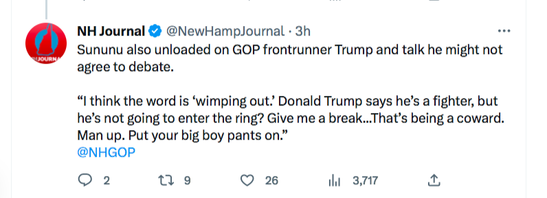 Look at me! Look at me! Everybody look at me! Poor Sun-King Sununu … not many people are taking his make-believe, pretend Presidential campaign seriously. Rather, they overwhelmingly see it for what it is … an exercise in narcissism, by a hopelessly entitled adult-child who refuses to ever grow up. So His Majesty is throwing a hissy fit: