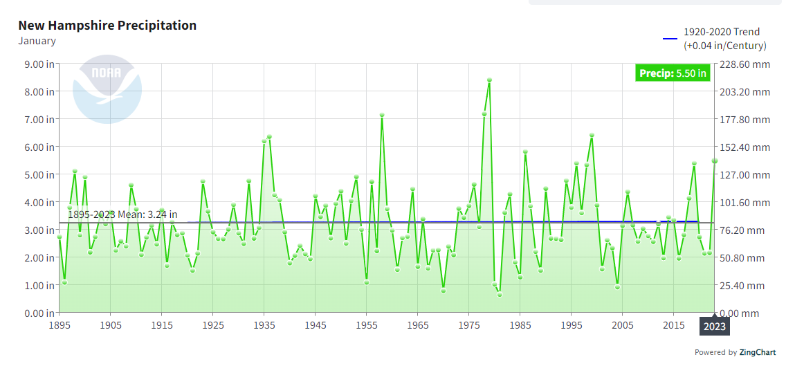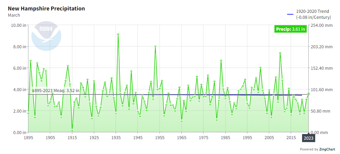 According to NOAA, New Hampshire has received 10.69 inches of precipitation through March. The 120-year mean 1895-2023 is 9.73 inches.