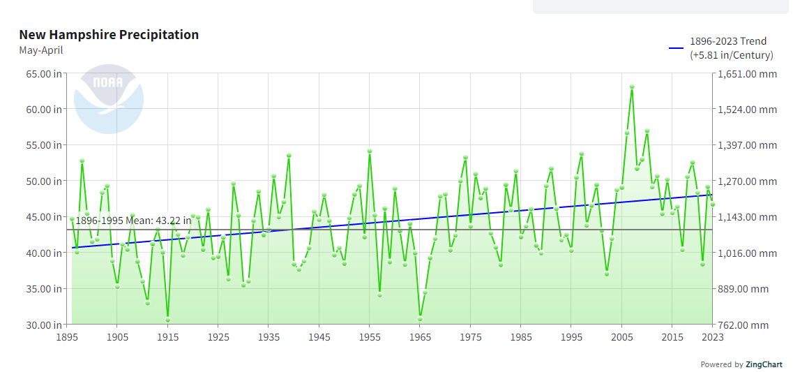This is the average annual precipitation in New Hampshire from May to April from 1895-2023.