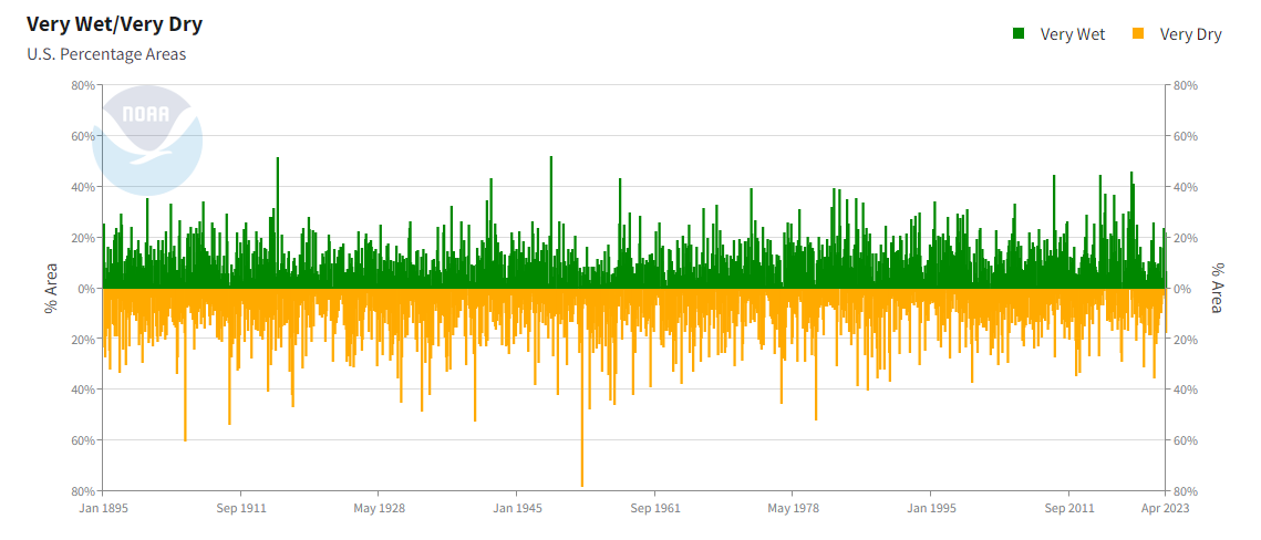 Let’s look at the entire country from 1895 to 2023. There is (net) zero evidence of any relationship between the “emissions” and how wet or dry it is.