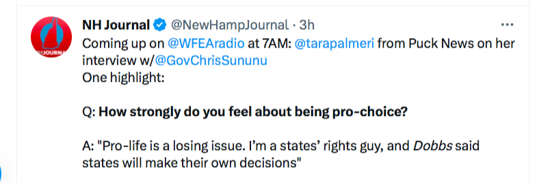 There is a saying that a soft life produces weak men. In Sun-King Sununu’s case it is a weak, soulless man. Our not-so-little Lord Fauntleroy … a narcissist, who loves to hear himself talk … says that pro-lifers are LOSERS. I kid you not. From his publicist, the NeverTrump grifter, Mikey Graham: