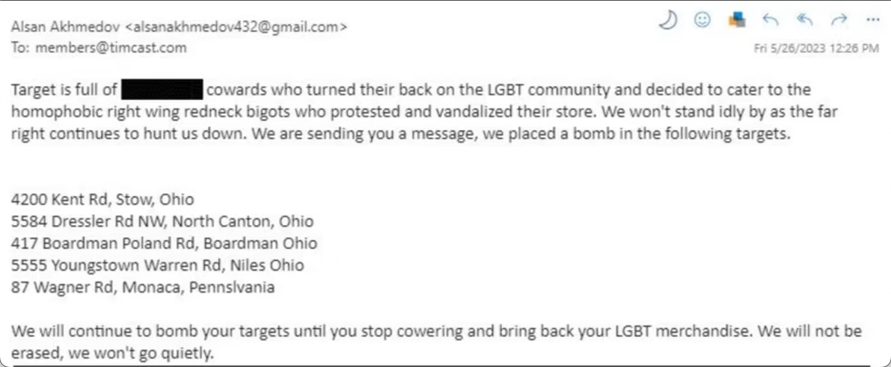 Target is having a Bud Light moment. The Media’s response claimed queer gear was removed because of threats to Target employees from the right. That was a lie, but this isn’t—at least one LGBT extremist has made bomb threats.