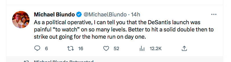 And, Rath added, “I’m not sure I could name the last thing the DeSantis team did right, either tactically or in its execution. The last couple of days for the DeSantis campaign, while not fatal, are at best a badly missed opportunity. The candidate and the campaign need to do a lot better.”