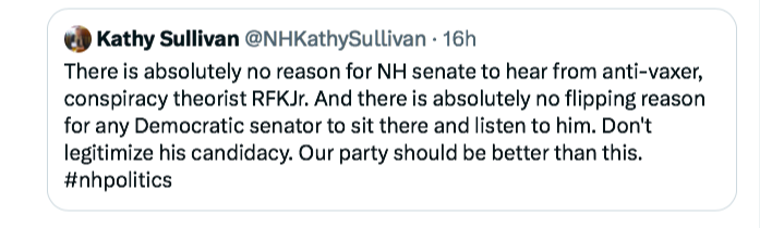 Kathleen Sullivan … Union Leader columnist and Communist (oh! I’m so sorry! I mean “Democrat”) operative … wants RFK, Jr. censored/banned/deleted and one of the reasons the Union Leader columnist gives is that he is a COVID “vax-denier”:
